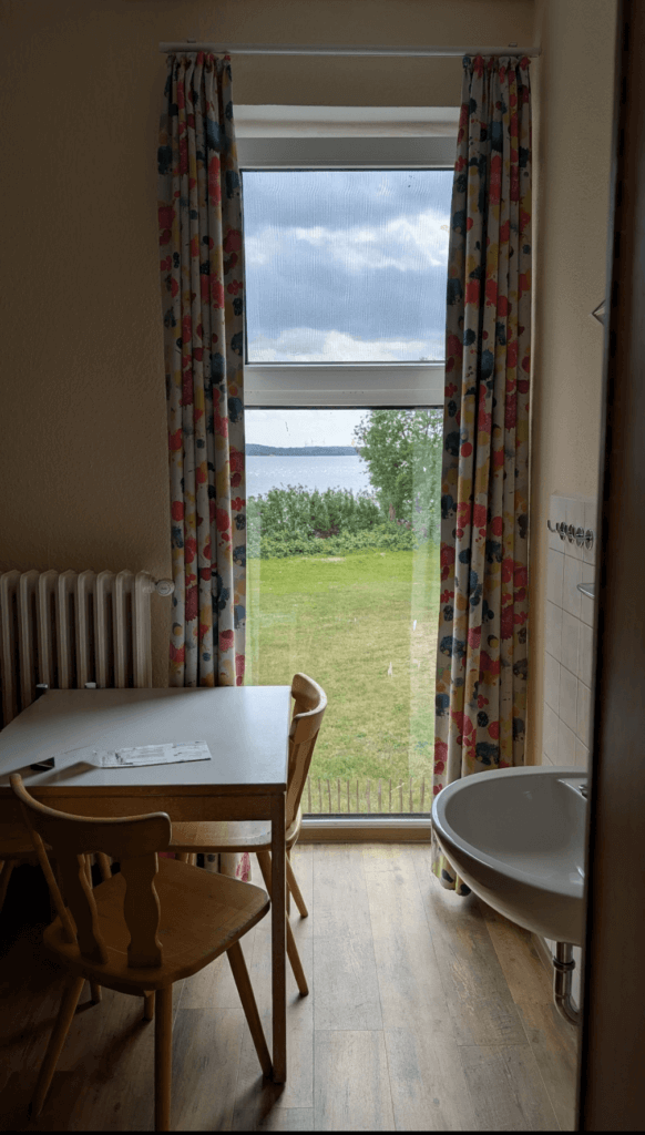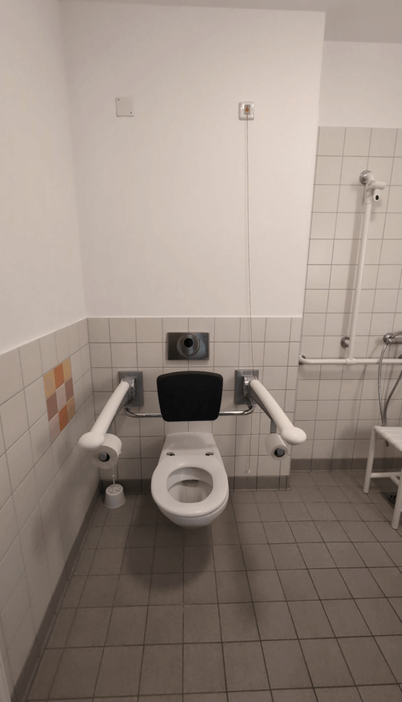 Es gibt zwei rollstuhlfreundliche Zimmer, die sich ein barrierefreies Bad teilen. Das Bad war richtig großzügig, sogar mit elektrischer Spülung ausgestattet. Praktisch zu wissen: Die Etagenbetten im Zimmer lassen sich nicht nach oben klappen was für manche vielleicht ein wichtiger Punkt sein könnte. Mein schwerer E-Rolli hatte dort auf jeden Fall jede Menge Platz, und der Ausblick direkt auf den See war einfach traumhaft.
