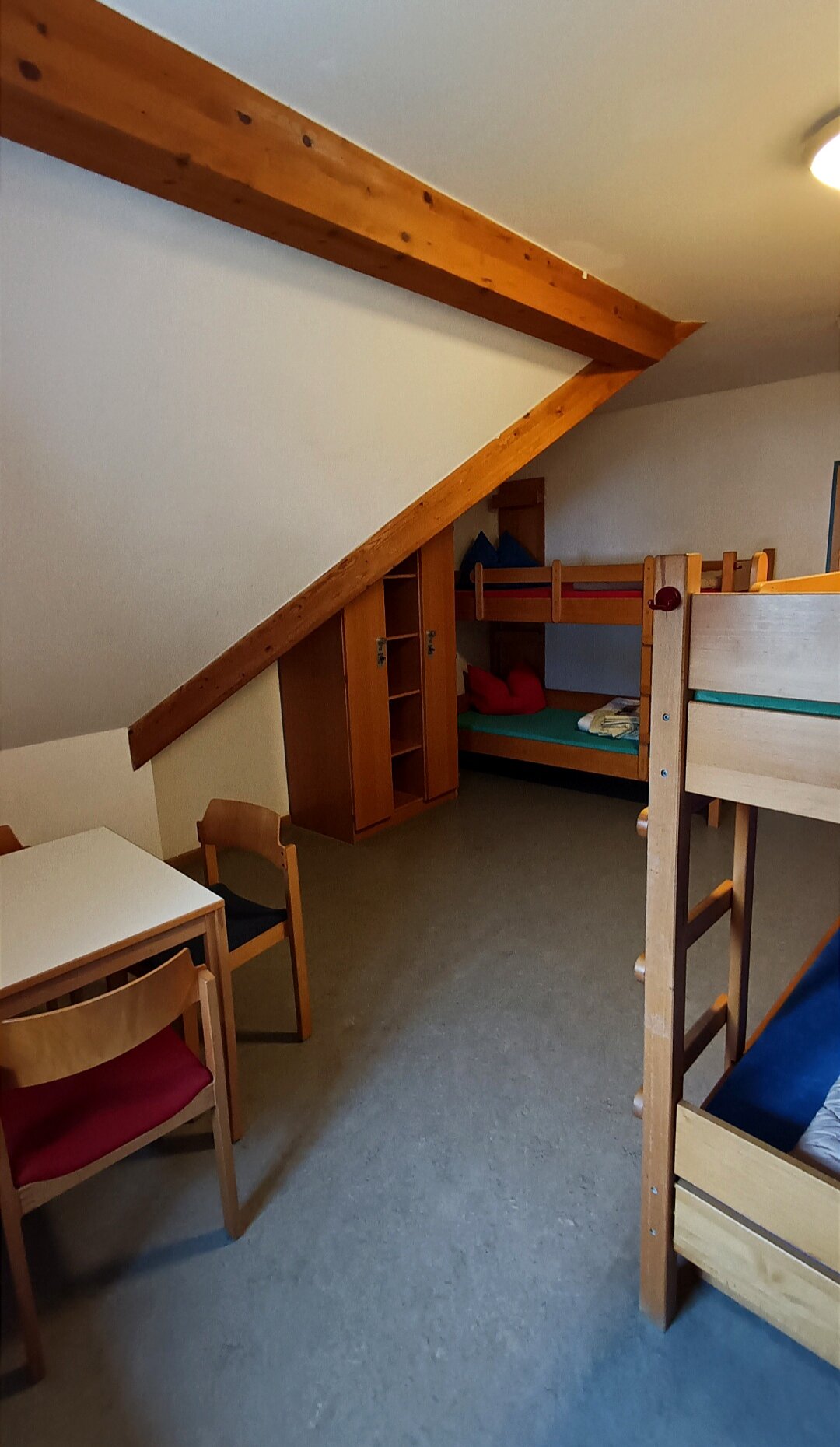 Unser Zimmer war supergemütlich – mit kleinen Fenstern, roten Gardinen und rustikalen Balken – genau nach meinem Geschmack.