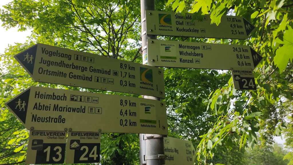 Heute Morgen habe ich mich ein wenig verschätzt, was Strecke und Höhenmeter angeht. Ich war zu Fuß auf der Suche nach einer neuen Wanderstrecke für den Rollstuhl und folgte den Schildern des Eifelvereins – Braubachtal Tour 14.