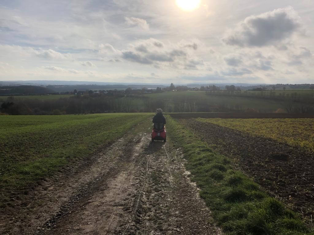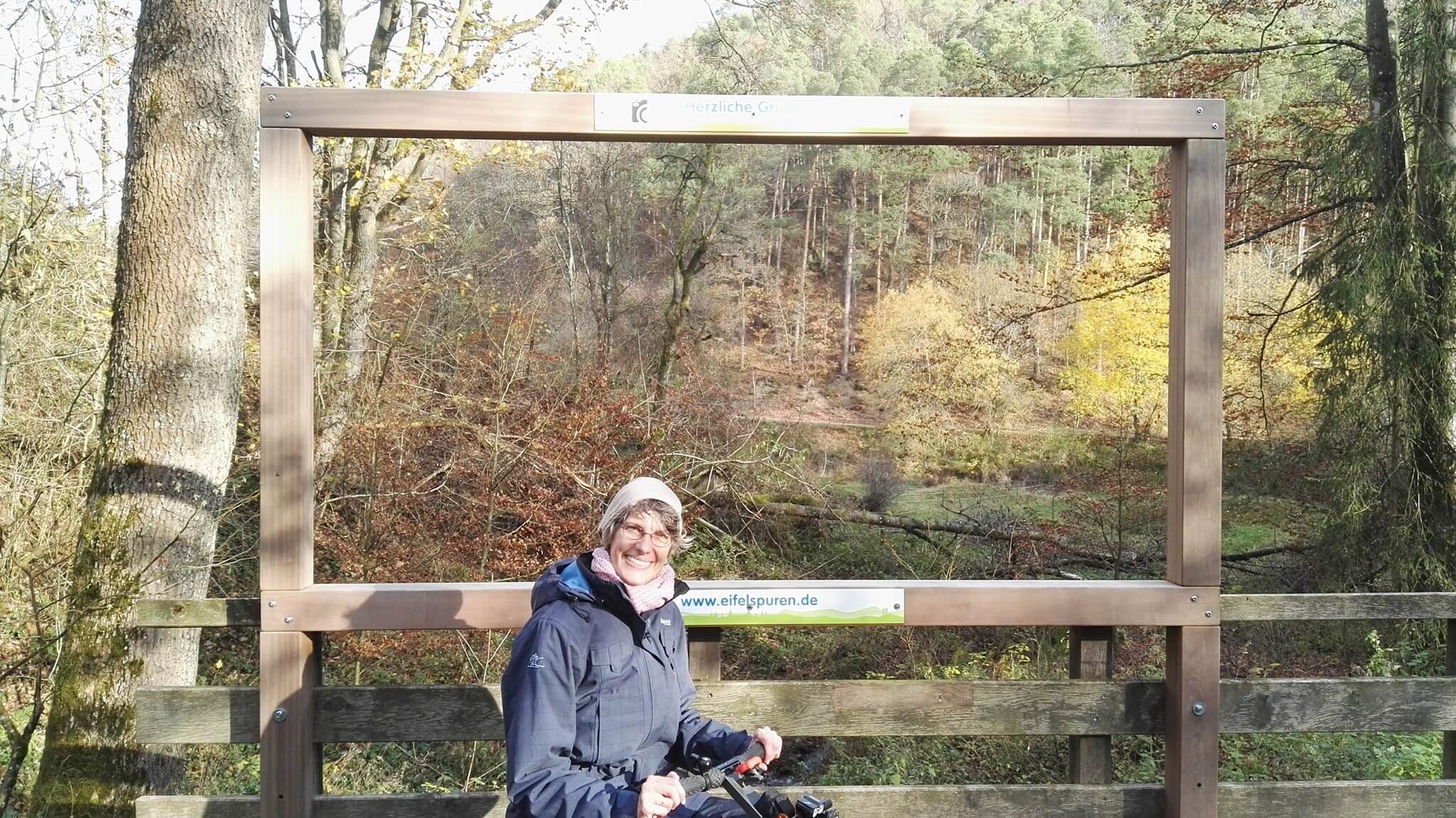 Dort konnte ich sehr gut mit meinem Rollstuhl fahren. Ab der Wanderhütte „Im Katzensief“ wurde der Boden zunehmend schlammiger, und es gestaltete sich durch die enorme Steigung immer schwieriger. Für einen solchen Rollstuhl war der Weg schließlich nicht mehr geeignet. Bei dieser Fahrt erlebte ich meinen ersten und letzten Sturz mit diesem Hilfsmittel. Durch die Mischung aus Steigung, Matsch und Blättern hatten meine Räder keine Bodenhaftung mehr und rutschten nach hinten weg. Da lag ich wie ein Käfer auf dem Rücken und hatte 80 kg Rollstuhl auf mir liegen. Zum Glück war mein Retter in der Not an meiner Seite und half mir aus dieser misslichen Lage. Eine Situation, die mir schrecklich peinlich war, zumal gerade eine Gruppe Wanderer an uns vorbeiging. Ich dachte: „Jetzt bloß nichts wie weg hier.“ Aus Angst, dass mir das Gleiche wieder zustoßen könnte, fuhr mein Retter den Rollstuhl den Berg hinauf. Oben in Dreiborn angekommen, wählten wir die asphaltierte Straße, um zu unserem Start-/Endpunkt zu gelangen.