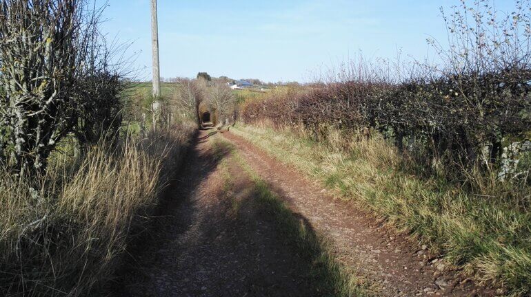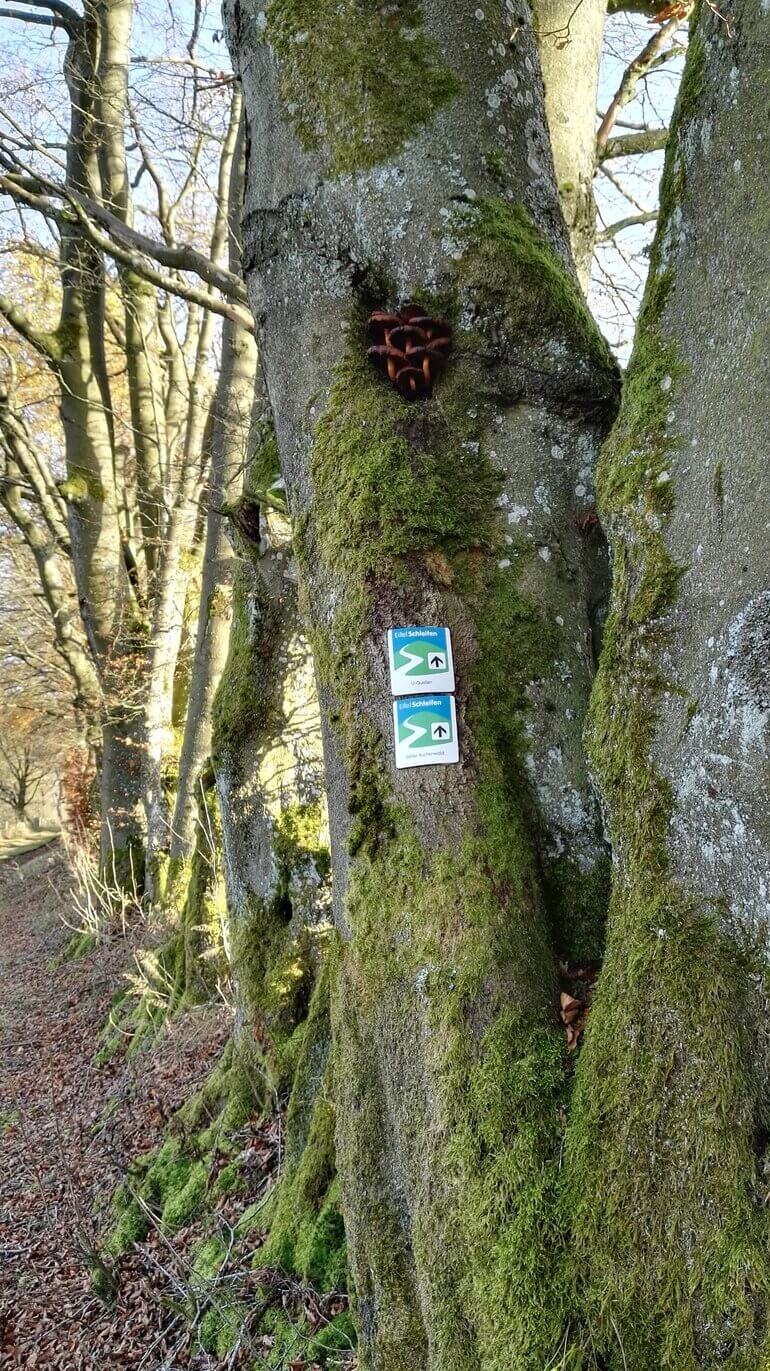 Am Startpunkt wo wir auch unser Auto stehen lassen konnten war alles bestens mit Wegweisern ausgeschildert. Wir folgten dem Wegweiser „ EifelSchleife Wilder Buchenwald“.Dort bogen wir nach einem weiteren Wegweiser links in einem Feldweg ab. Er führte einen Berg hinunter. Leider war der Weg durch die Spuren eines Traktors sehr aufgewühlt, wieder ein Gemisch aus Matsch und Blättern.