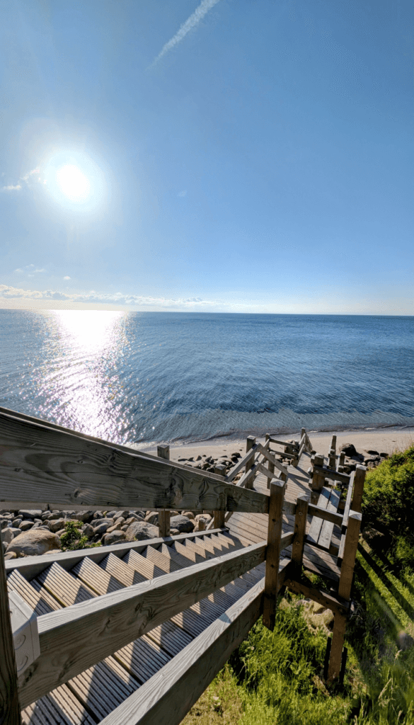 Einen direkten Zugang zum Strand gibt es leider nicht ohne Treppen. Die steile Treppe hinunter ist für Rollstuhlnutzer nicht befahrbar. Trotzdem ist der Ausblick von oben unvergesslich, besonders morgens, wenn die Ostsee in Ruhe liegt und eine angenehme Stille ausstrahlt.