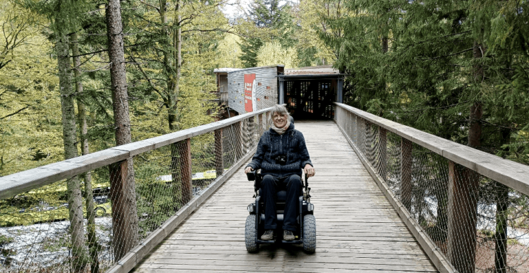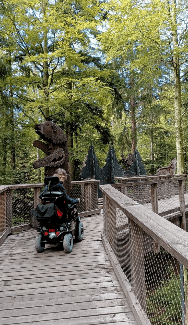 Wir starteten mit dem Baumwipfelpfad, einem der längsten seiner Art weltweit. Ein Personenaufzug brachte uns nach oben, wo der Einstieg begann. Zu meiner großen Freude gelang mir das Rangieren mit meinem neuen Rollstuhl problemlos – ein Modell, bei dem ich mit den Hinterrädern lenke, was ein ganz neues Fahrgefühl bedeutete.