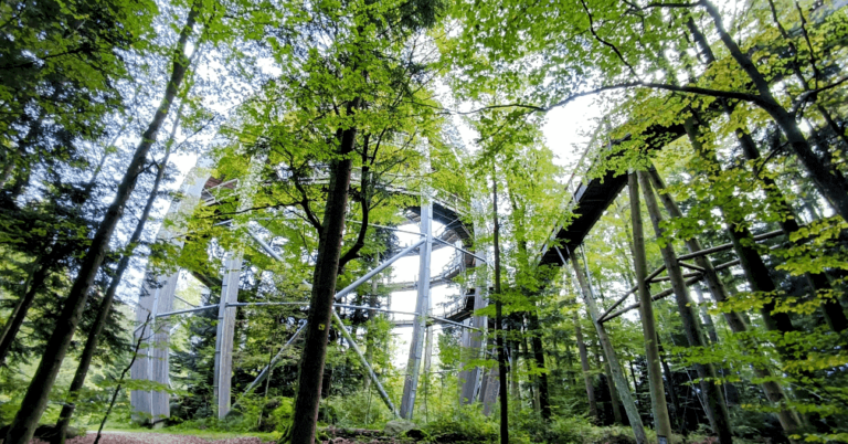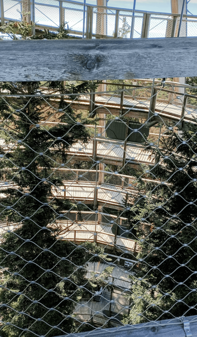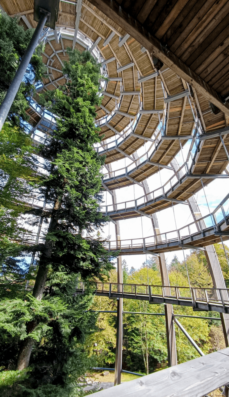 Das Highlight ist die Spitze des Turms, der mit seiner Ei-Form irgendwie etwas Besonderes ist. Auf 44 Metern Höhe genießt man einen atemberaubenden Blick über den Bayerischen Wald. Die Steigung beträgt nur 6 %, sodass der Weg entspannt mit dem Rollstuhl befahrbar ist.